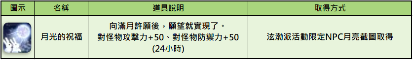 BUFF效果:對怪攻擊力+50, 對怪防禦力+50(24小時)