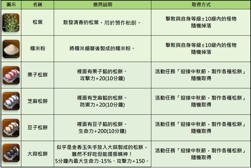 ※活動任務道具「松葉、糯米粉」、活動獎勵道具「栗子松餅、芝麻松餅、豆子松餅、大蒜松餅」將於活動結束後的進行回收,還請大俠們盡早使用完畢。