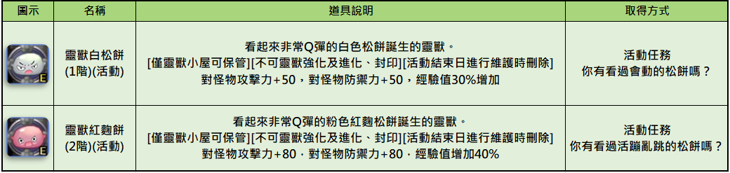 ※靈獸白松餅(1階)(活動)、靈獸紅麴松餅(2階)(活動)兩項道具將在活動結束時進行回收
