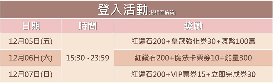 2025-12-05 (五)~2025-12-07(日),天天登入送獎勵。