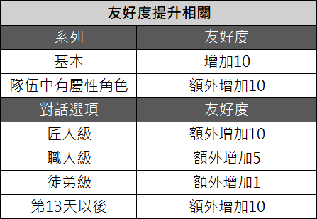 *將定屬性角色編入隊伍中進行對話及回報任務可以增加提升的友好度。