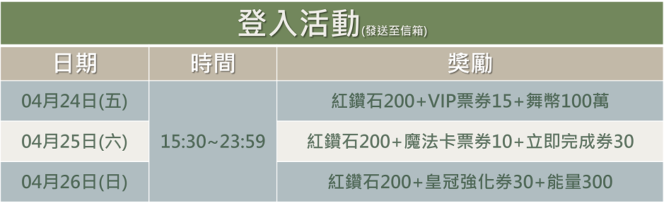 2026-04-24 (五)~2026-04-26(日),天天登入送獎勵。