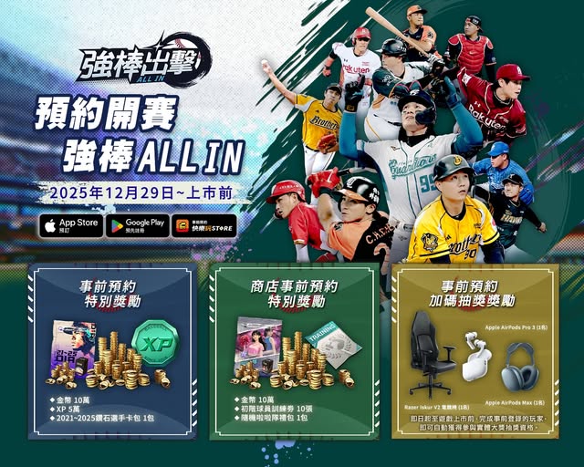事前預約全面開放 別錯過這些限定獎勵 粉絲團活動同步進行中! 趕快邀請你的隊友一起 ALL IN 出擊吧 事前預約活動頁 App Store預約 Google Play預約 快樂玩 ONE STORE預約 #強棒出擊ALLIN #預約開賽強棒ALLIN