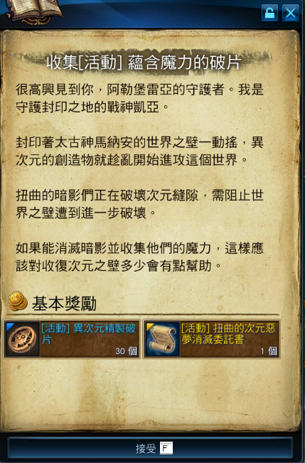 異次元破片可與活動NPC兌換各種物品;惡夢消滅委託書則為更進一步的任務,點擊使用後即可獲得下一階段的任務指示,請依照說明攻打指定活動怪物,完成凱亞的系列委託吧。