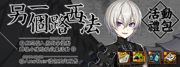 | [Another] 強化綜合禮包 | 強化器防護劑x20 幸運強化器燃料x10 一般強化器燃料x100 UMP 1,000 x6 |