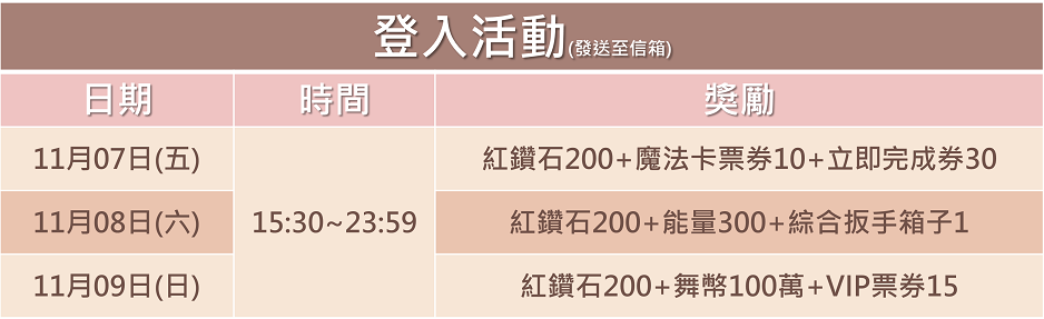 2025-11-07 (五)~2025-11-09(日),天天登入送獎勵。