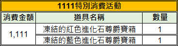 3. 胖達於11/11 00:00 ~ 23:59間消費1,111點,於11/12 00:00 ~ 23:59間消費1,111點,在活動結束後即可獲得「「凍結的紅色進化石尊爵寶箱×2」、「凍結的藍色進化石尊爵寶箱×2」。