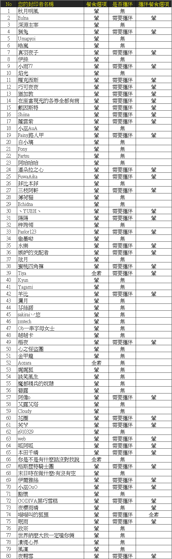 本日正式公布本次見面會的 最終入場名單。名單內容將顯示:特工名稱、是否有攜伴、餐食選項。