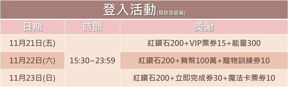 2025-11-21 (五)~2025-11-23(日),天天登入送獎勵。