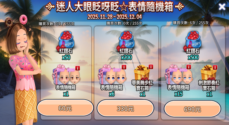 【禮包內容】 【販售期間】 2025/11/28 12:00~2025/12/04 23:59 ※抽中重複永久商品將自動轉換為魔法卡*5。 【商品機率】 ღHAVE A GOOD GAMEღ 【注意事項】 1.實際功能以遊戲內容為主,樂意傳播保留最終解釋權。 2.樂意傳播保留終止 、修改活動內容之權利,若有變更事項將另行說明。 3.如因個人網路不穩,導致斷線、連接失敗等問題,活動將照常舉行,不另做補償。