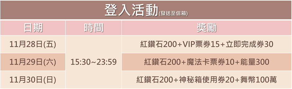 2025-11-28 (五)~2025-11-30(日),天天登入送獎勵。