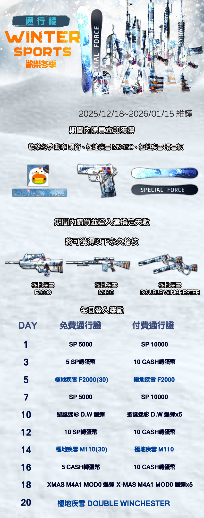 另外在 網頁商城 購買【歡樂冬季通行證】,還可額外獲得付費通行證的專屬登入獎勵序號及