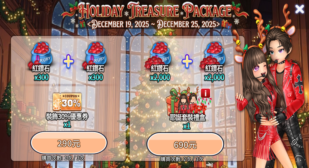【禮包內容】 這次禮包裡的都是儲值紅鑽石喔~ദി ᴖ ·̫ ᴖ ) ※裝飾30%優惠券需於領取後1小時內使用完畢,逾期不補發※ 【販售期間】 2025/12/19 12:00~2025/12/25 23:59