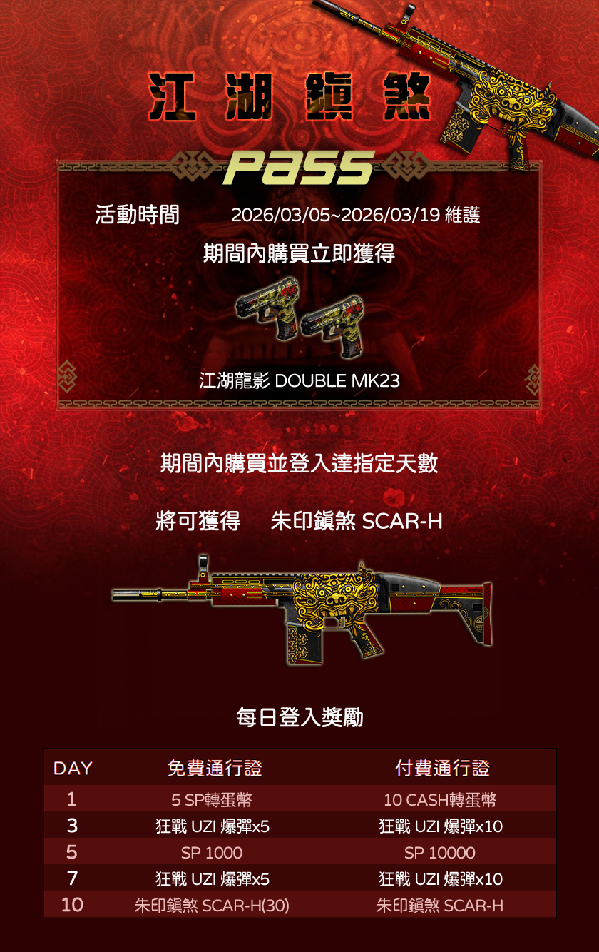 還可額外獲得付費通行證的專屬登入獎勵序號及江湖龍影 DOUBLE MK23(永久)