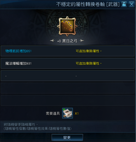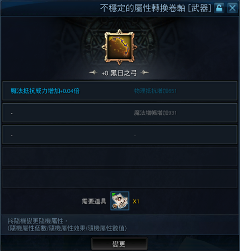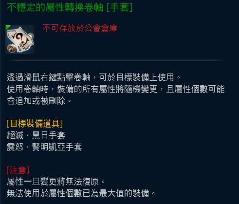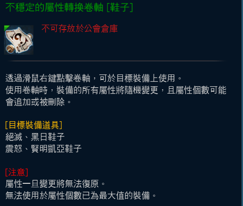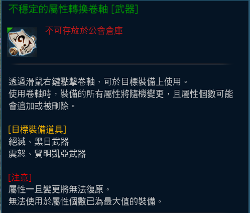 【絕滅、黑日、震怒凱亞、賢明凱亞】系列裝備,可使用【不穩定的屬性轉換卷軸】進行屬性的隨機變更,請注意在使用卷軸時,裝備的所有屬性將隨機變更,且屬性個數可能會追加或刪除