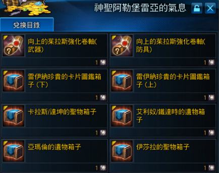 此次更新後,高階副本追加掉落新道具【神聖阿勒堡雷亞的氣息箱子】,點擊打開後可獲得【神聖阿勒堡雷亞的氣息】,可兌換珍貴的新道具,詳細道具圖片資訊請參考如下。