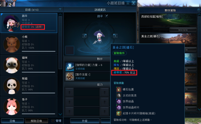 ┗新增指定疲勞度條件,若夥伴目前疲勞度低於冒險指定的疲勞度,則無法派遣