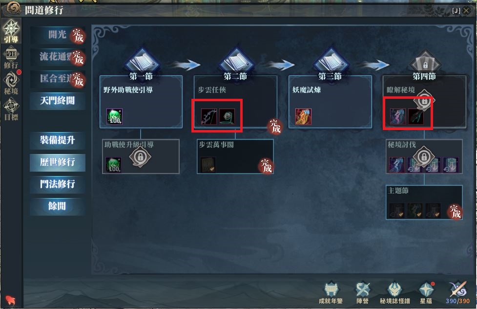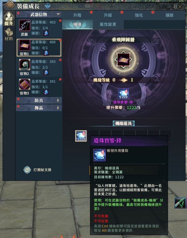※通關當前版本高難度副本,有機會掉落高級符咒配方,詳細可參考「問道修行-秘境-掉落獎勵」 【機緣】天花符拿完了?沒關係,還能再變更強! 裝備品質等級達400以上時,該部位可進行機緣。當【秘文冊】→【添花符】購買「靈悟妙化」的添花符都取得完畢後,則自動轉化「遺珠寶鑒」,來進行機緣。