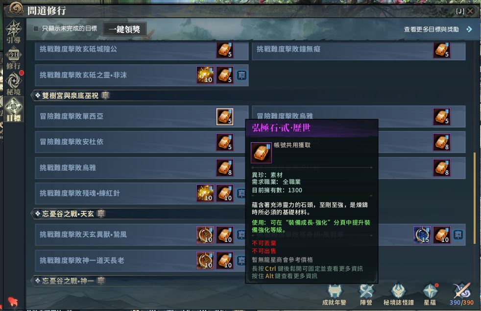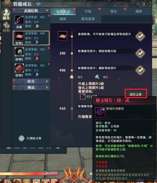 ※需透過「日常/周常任務」取得的「秘文殘片」,才可增加裝備強化上限。