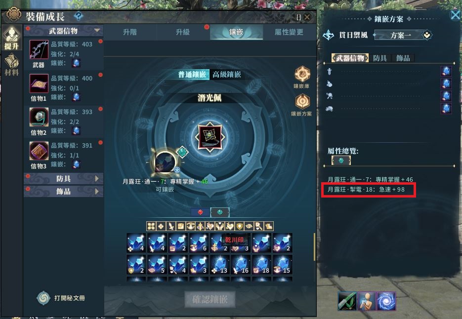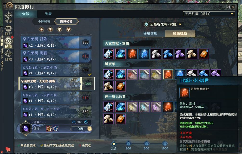 【鑲嵌】可針對需求屬性鑲嵌,取得來源幾乎都在副本。請務必要每天刷當前版本副本喔。 透過【問道修行】完成「目標」、「副本」時,可獲得「日露玨/月露玨/乾川印」鑲嵌寶石,隨著升階等級越高,可裝備更高級的鑲嵌寶石
