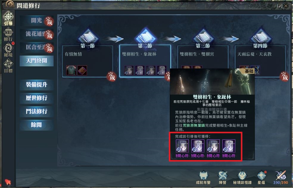 【升階】 重要!快速提升裝備品質全靠這個了!還請務必取得所有添花符! 透過【問道修行】完成特定「目標」、「引導章節」、「副本」時,可獲得基礎升階道具「添花符」。