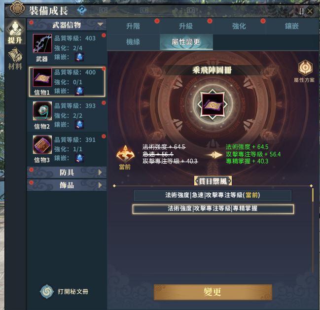 ※機緣最高上限為5級 ※機緣等級不受豪俠限制裝等影響,若需攻略豪俠副本,還請務必進行機緣喔! 【屬性變更】任君挑選,改變成適合自己的屬性吧~ 透過【問道修行】完成「目標」、「引導章節」時,可獲得「四時問心符」來解鎖「武器」、「信物」、「防具」的屬性。
