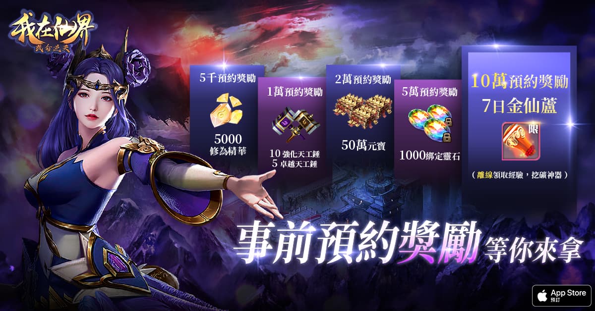 《我在仙界改命逆天》即日起展開事前預約。營運團隊指出,凡完成事前預約成功的玩家,在遊戲24日正式營運時,可依據累積預約人數獲得相應獎勵。內容包含:提升戰鬥能力的「5000修為精華」、可為裝備開孔的道具「10個強化天工錘+5個卓越天工錘」、實用遊戲貨幣「50萬元寶」、儲值才能獲得的「1000綁定靈石」及可享有最高級月卡權利的「7日金仙蘆」