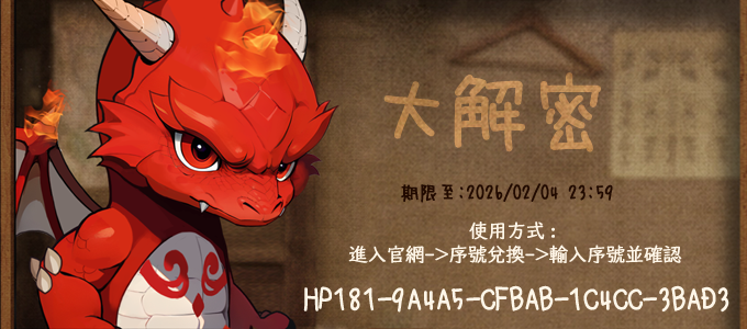 請輸入下圖中的文字後,點選確認鍵。驗證成功後即可獲得獎勵序號 !獎勵內含: 兌換期限僅至2026/02/04 23:59