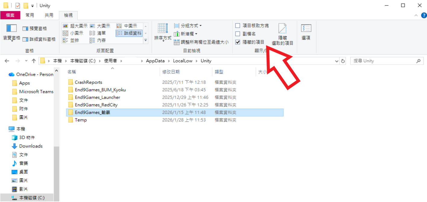 本機 → 本機磁碟(C:) → 使用者 → 使用者名稱 → AppData → LocalLow → Unity刪除 End9Games_輸贏 資料夾